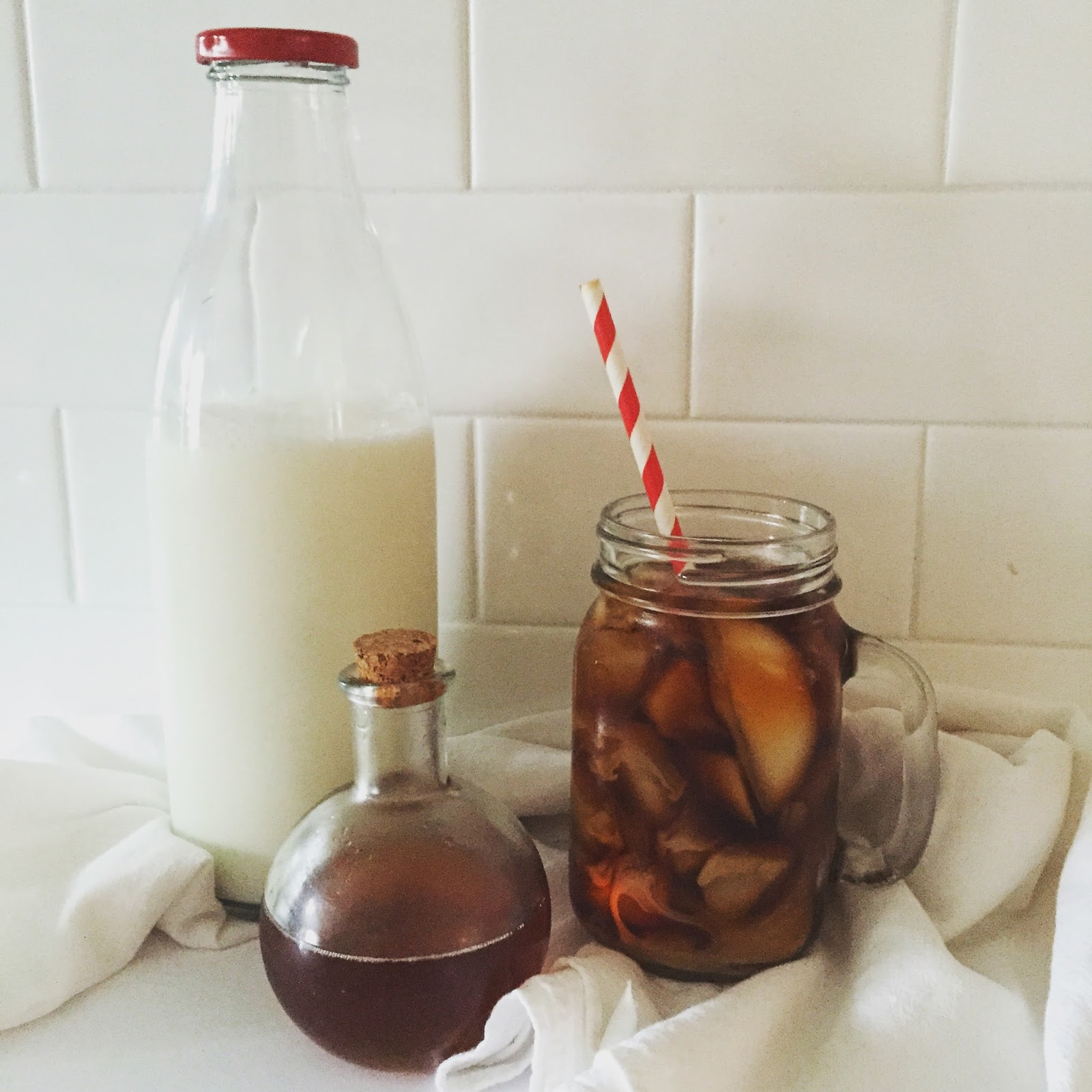 - Pour the coffee over ice, add your desired amount of mint syrup and milk. Enjoy!
