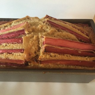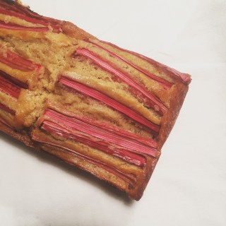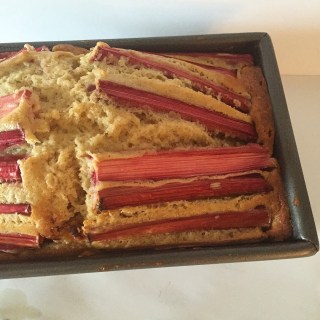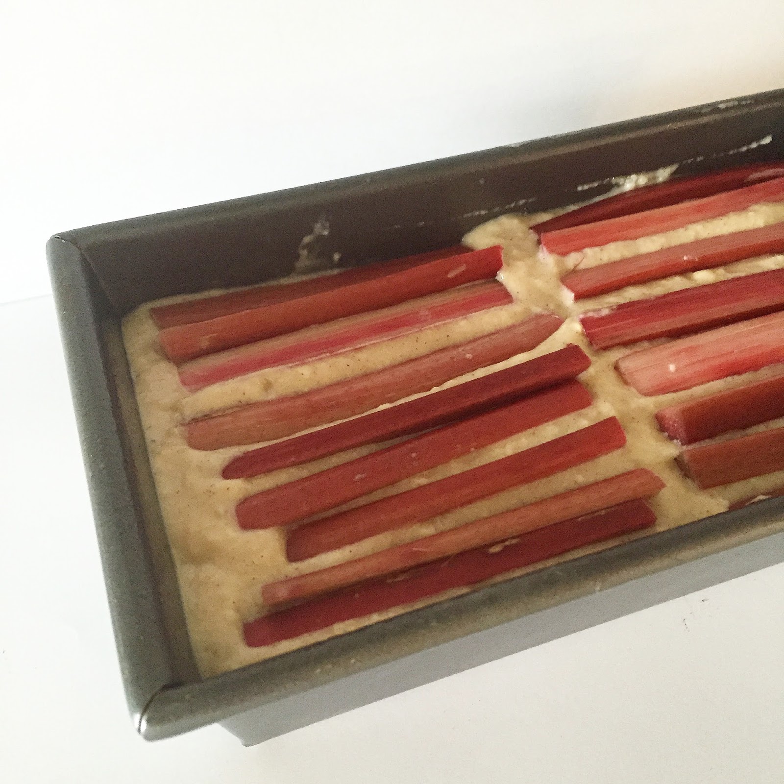 - Slowly mix in the flour, cinnamon and baking powder, then gently fold in the diced rhubarb. Pour into the greased pan, then top the bread with the length-wise rhubarb and gently press down the rhubarb into the top of the bread.