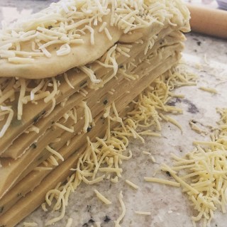 - Add the grated cheese onto each layer, and stack them atop one another.