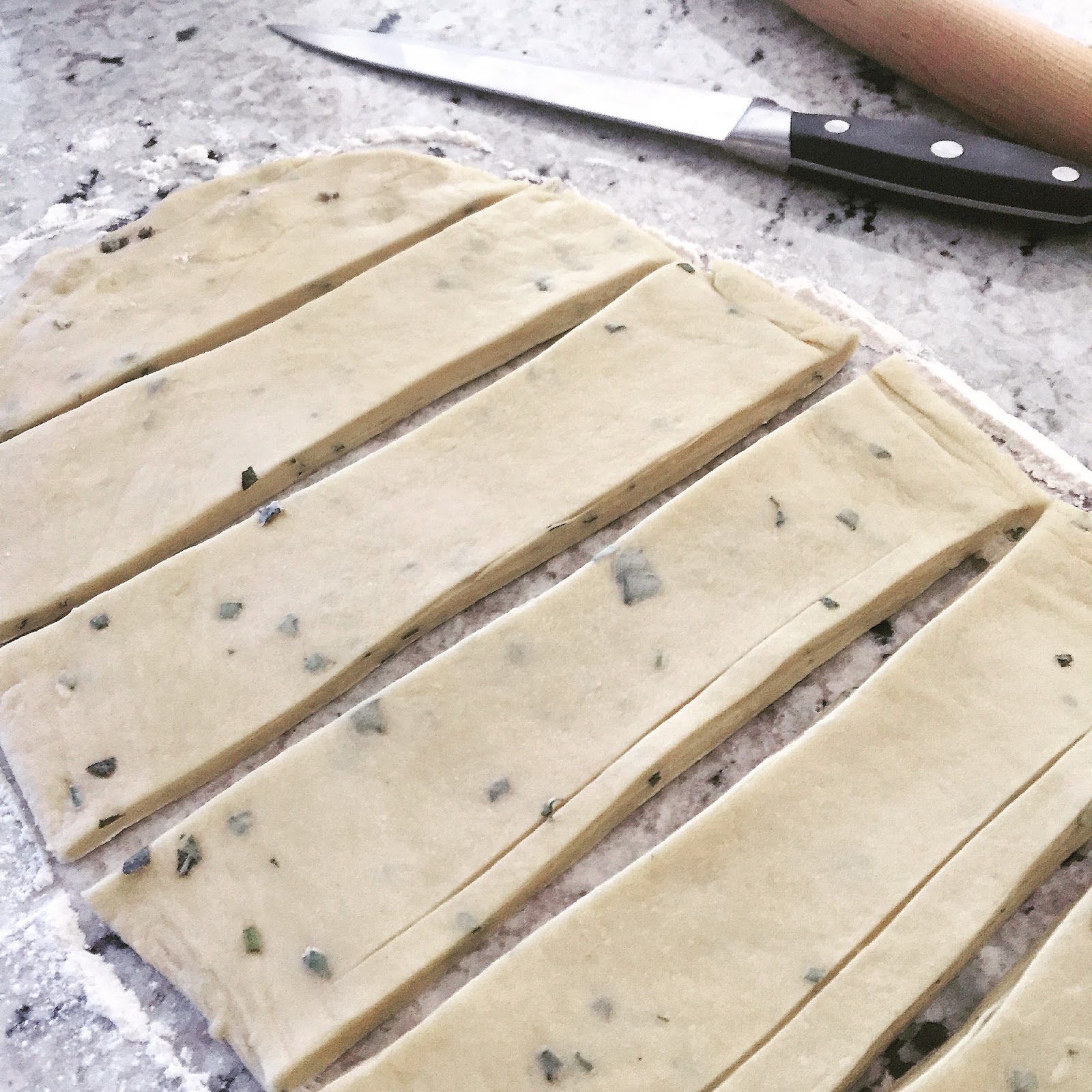 - In your Kitchen-Aid mixer, fitted with the hook attachment, add the yeast and warm water to the bowl and let sit for 10 minutes, until the yeast begins to bubble. Add olive oil, spices, salt, sage, chives & flour and at a low speed, knead the dough for 5 minutes. The dough should pull away from the bowl and be tacky to the touch, but not stick to your fingers.
