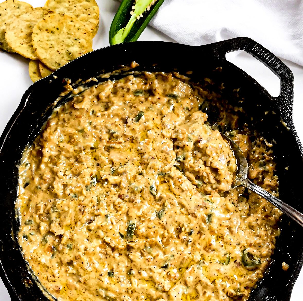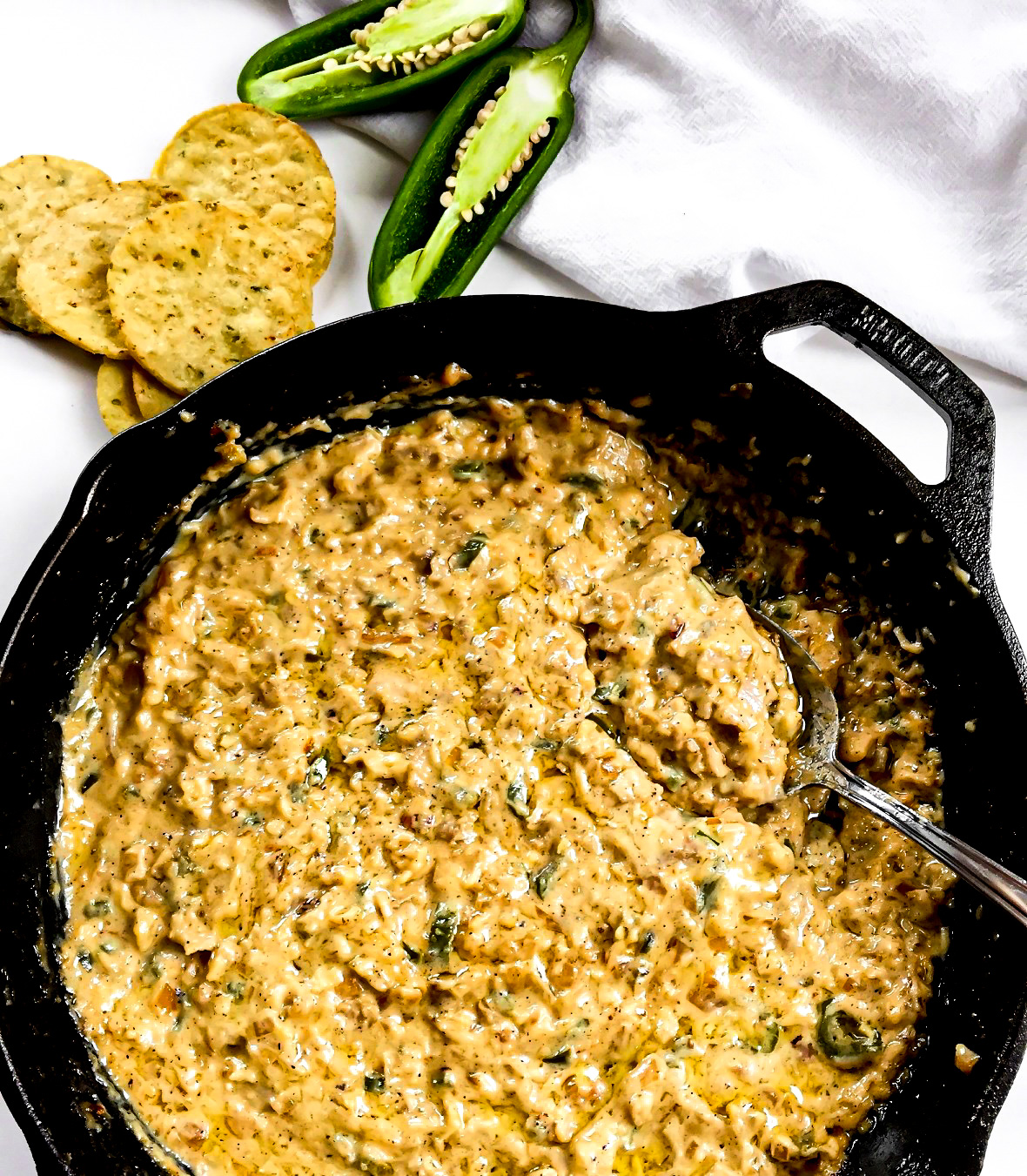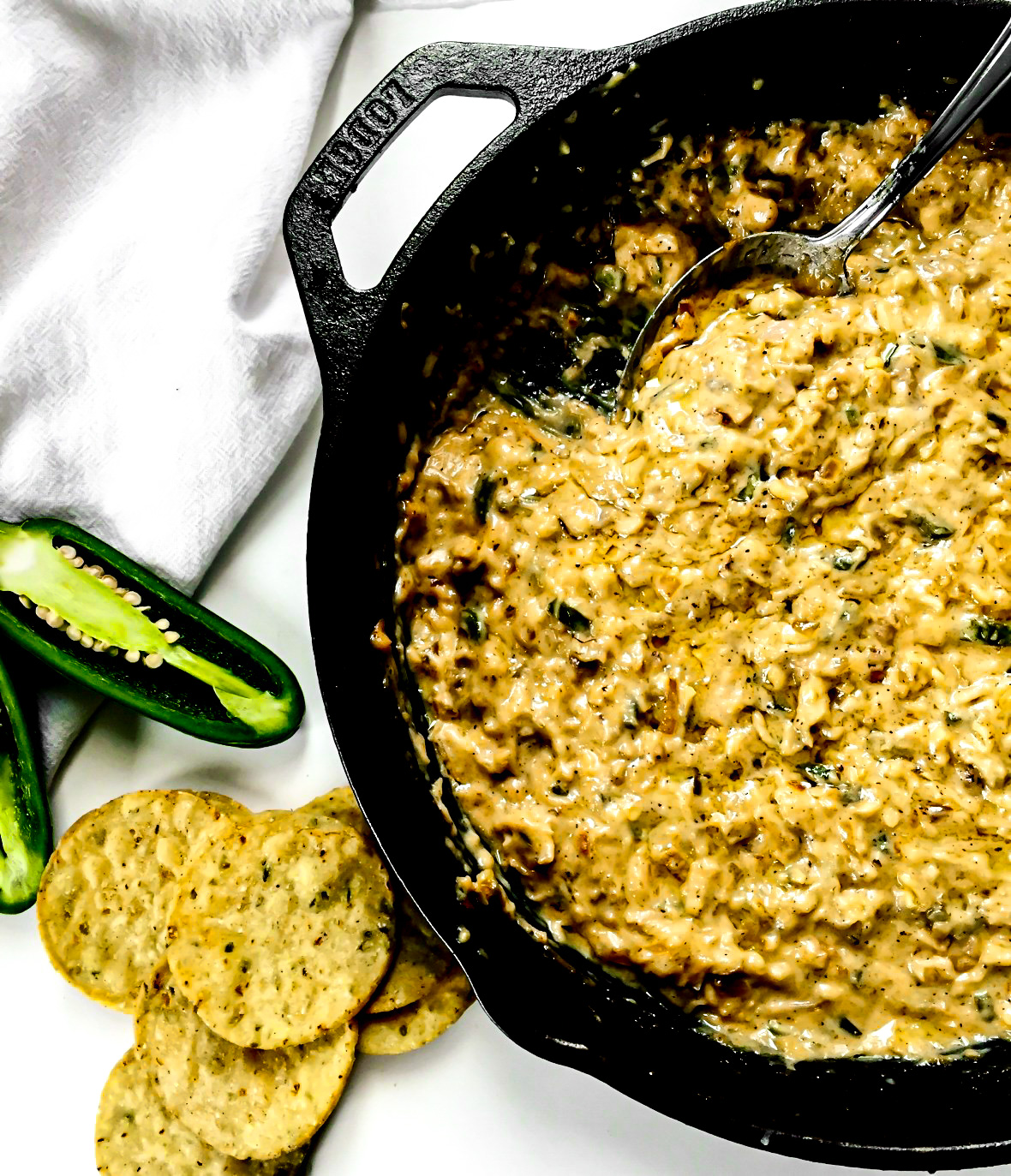 This spicy, cheesy + hearty dip is the perfect addition to any gathering or Super Bowl party!
