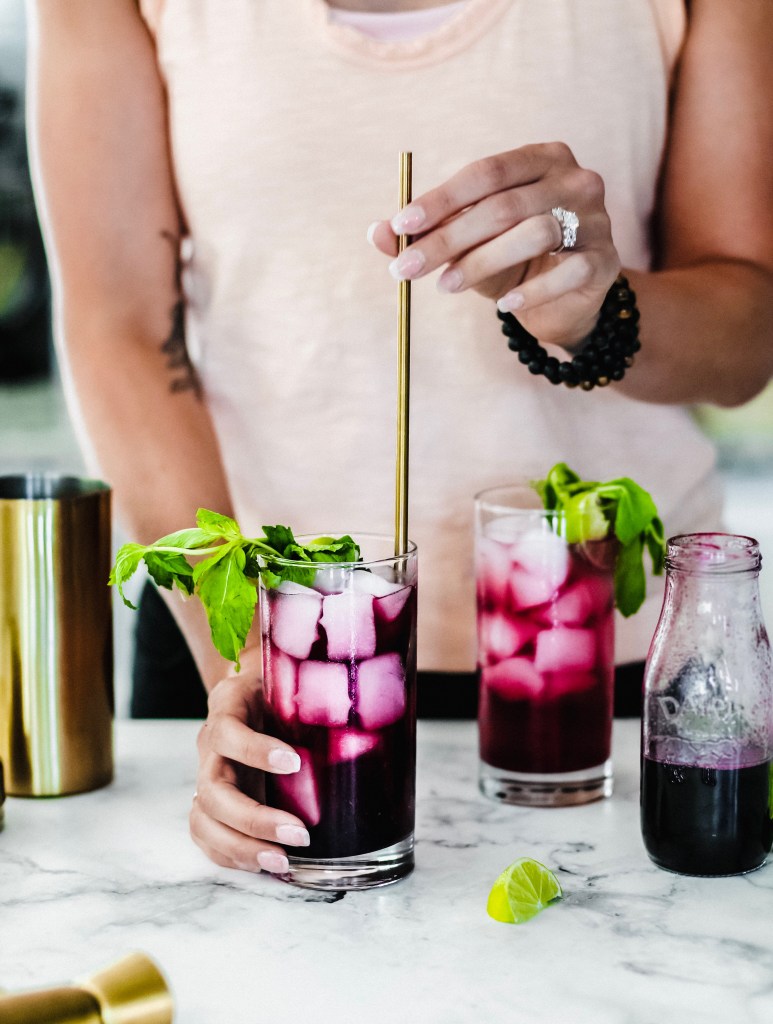 - Pour 1 oz of the blueberry simple syrup into each glass then top with club soda. Stir with a mixing spoon, garnish with a sprig of mint leaves and a lime wedge. Sip and enjoy!